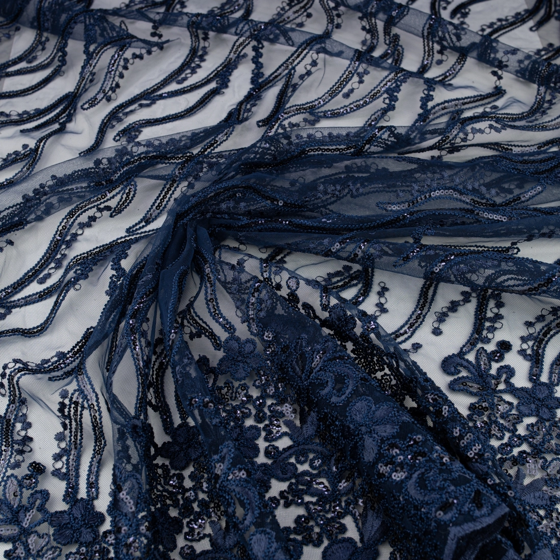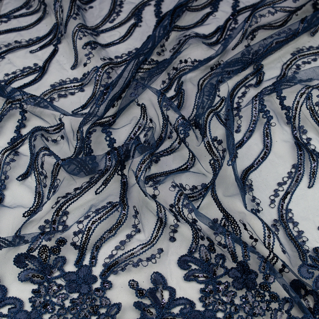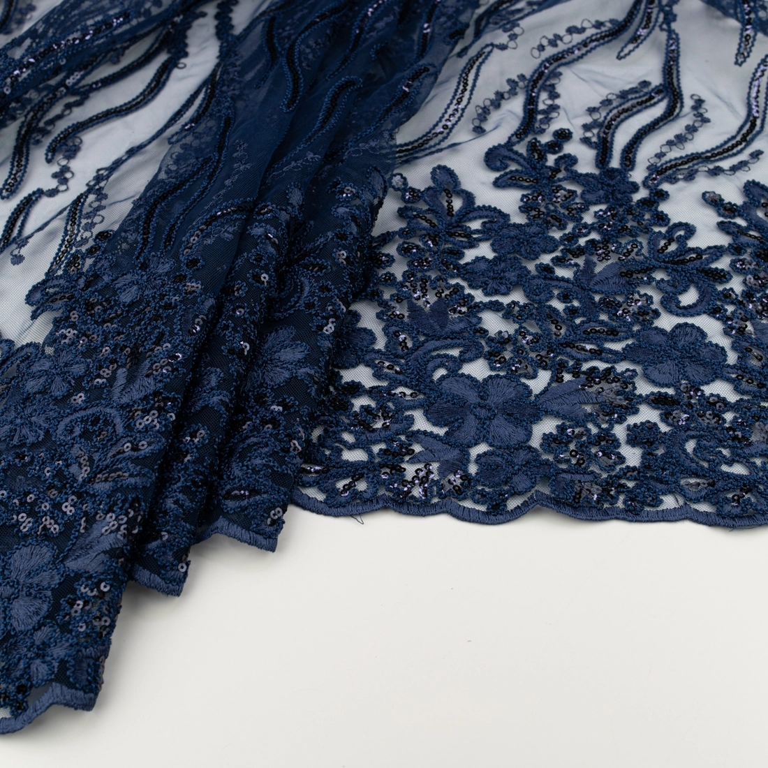 Sichern Sie sich jetzt diesen hochwertigen Spitze mit Blumen, Pailletten und Bogenkante navy – exklusiv bei TextileClub.de, Ihrem Online-Shop für elegante Stoffe zum Selbernähen!