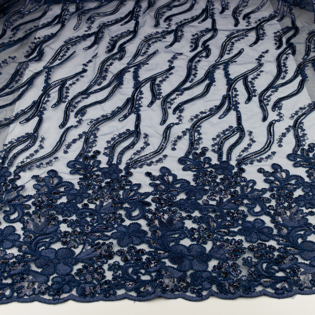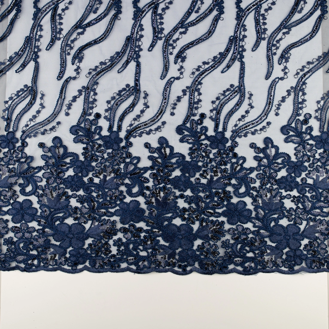 Spitze mit Blumen, Pailletten und Bogenkante navy